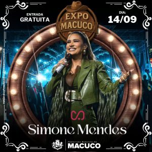 A Prefeitura Municipal de Macuco confirmou oficialmente a presença da cantora Simone Mendes como atração principal na abertura da 17ª edição da Expo Macuco. O show está marcado para o dia 14 de setembro, encerrando com chave de ouro o último dia do tradicional evento agropecuário.