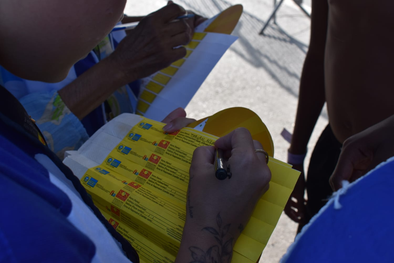 As pulseiras continham nome da criança, telefone do responsável e identificação da escola, além de diferenciação por cores, de acordo com a situação de acompanhamento.